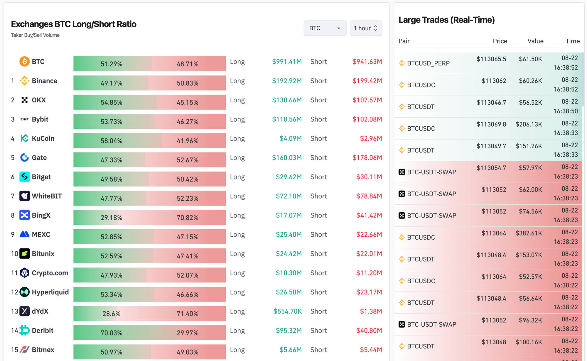Cryptocurrency Longs Shorts Ratio refer to the ratio of active buying volume to active selling volume on futures contract exchanges, which can reflect the market’s sentiment of long or short positions. You can check the bitcoin longs/shorts ratios for Binance, Bitmex, OKX, Bybit, Bitget, deribit and Bitfinex. We provide real-time data for Bitcoin contract long vs short ratio, exchange contract long/short ratio, and cryptocurrency contract long and short ratio, as well as historical data and chart analysis to provide you with comprehensive market information and reference for trading decisions.